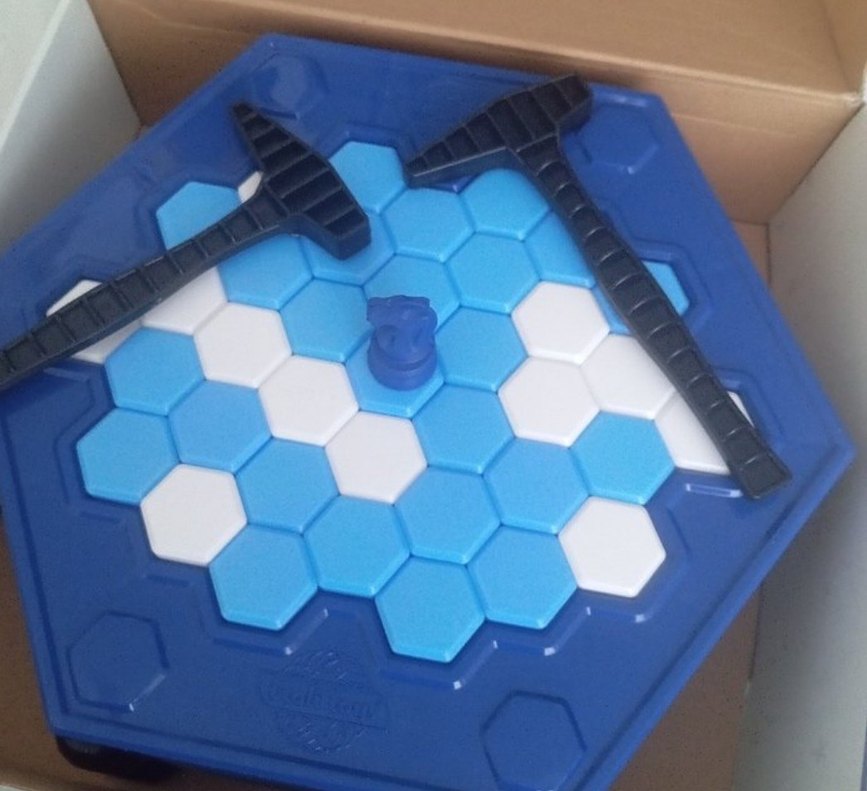 Mavi taban üzerinde koyu mavi ve beyaz altıgen parçalar, iki siyah araç ve küçük bir figür bulunan eğitici oyuncak.