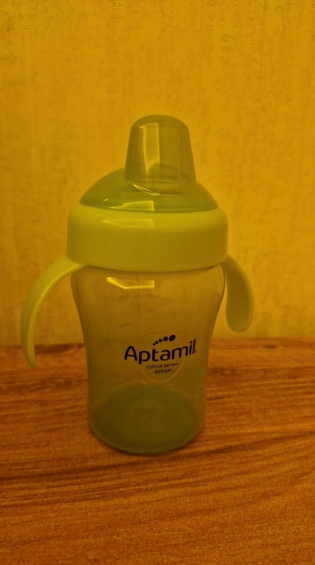 Mavi Aptamil akıtmaz kulplu bardak, kolay tutuş için kulplu ve rahat besleme için yumuşak emzikli.