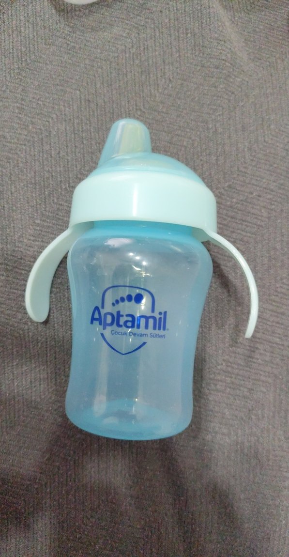 Pastel mavi renkte Aptamil bebek biberonu, kolay tutuş için kulplu ve yumuşak emziklidir.