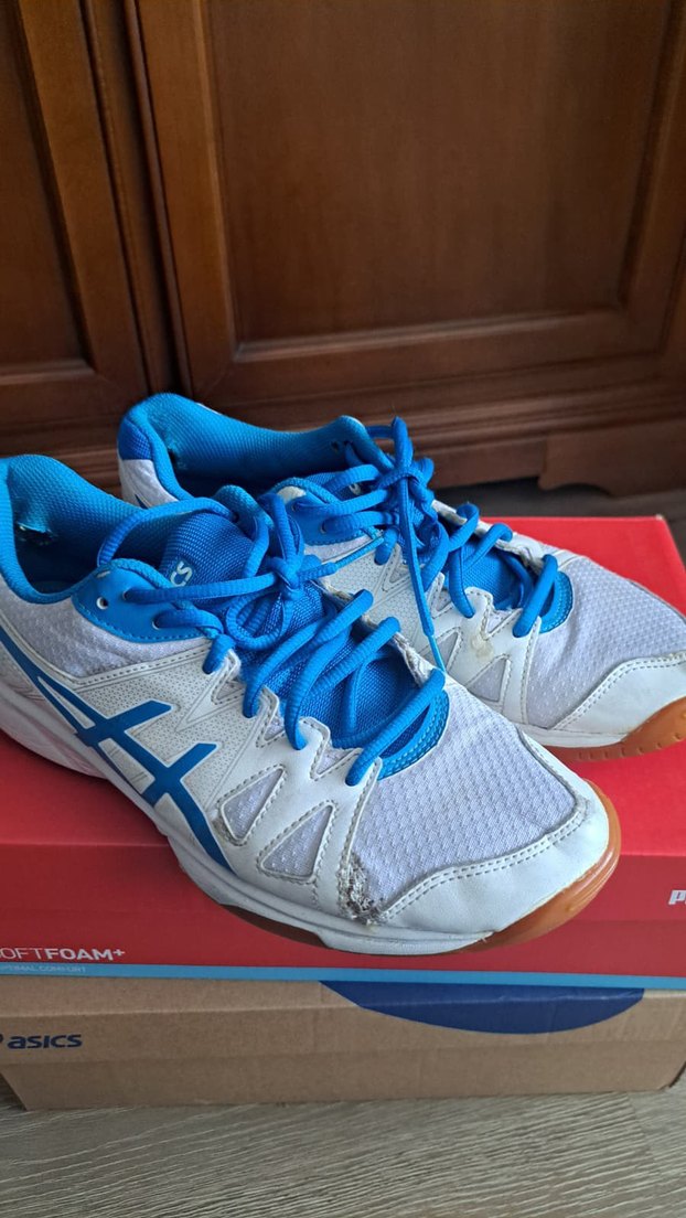 Mavi Asics spor ayakkabılar, bir yerinde hasar var fotoğrafta göründüğü gibi