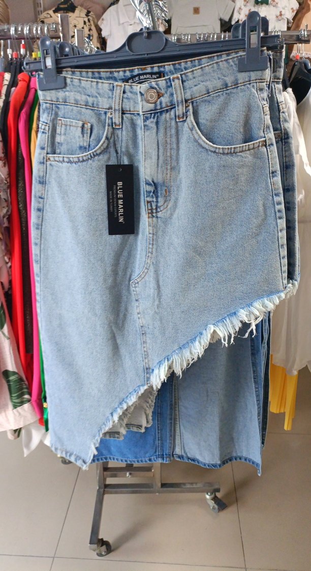 Açık mavi kot etek, asimetrik kesim ve yırtmaçlı, rahat kesimli sokak tarzı için uygundur. Püsküllü kenarları ve sade tasarımıyla günlük kullanıma uygundur.