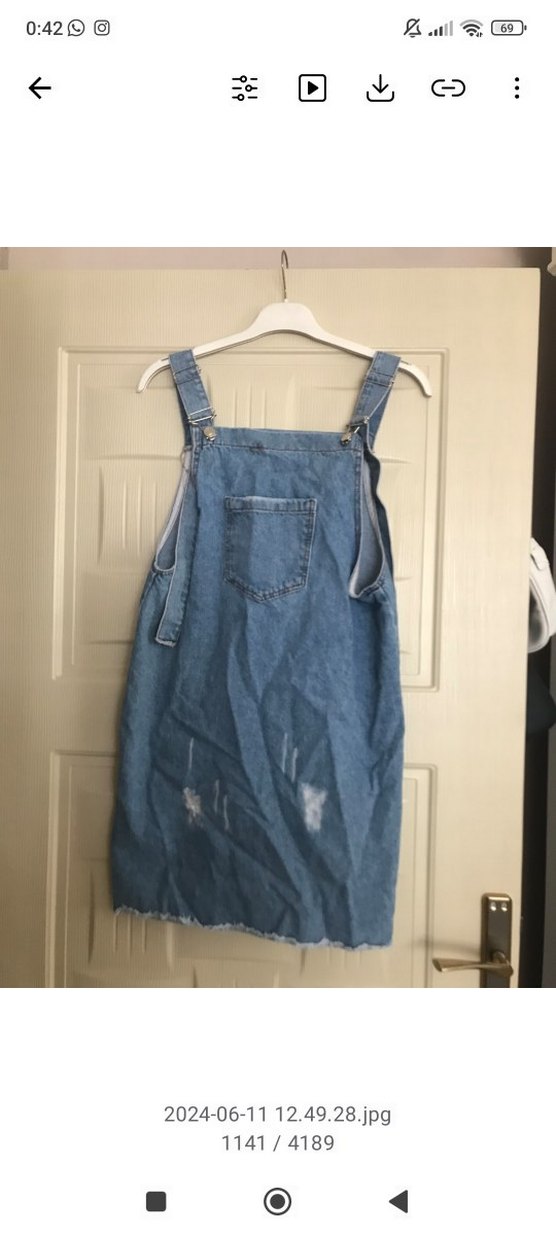 Mavi denim midi uzunlukta, askılı ve ön cepli, tokalı ayarlanabilir askılara sahip bol kesim tulum. Günlük sokak stili için uygundur.