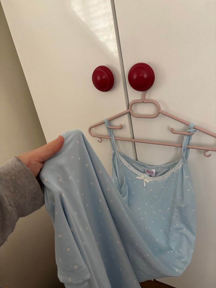 Pastel mavi renkte, askılı ve straplez yaka, bol kesim gecelik. Midi boyda, yumuşak ve rahat kumaşla konfor sağlar.