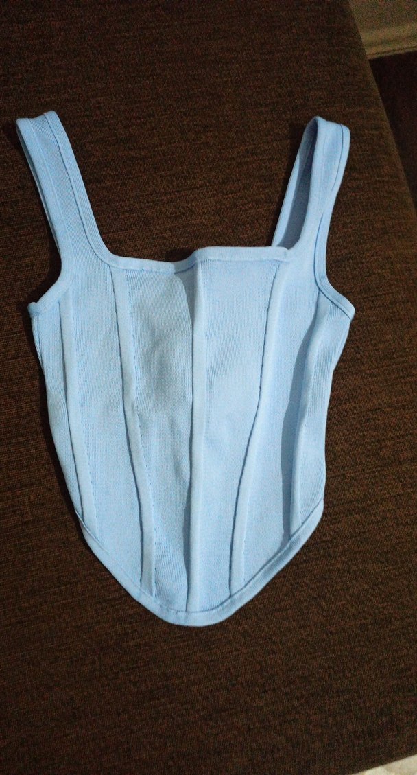 Bu mavi fitted büstiyer, askılı ve kolsuz tasarıma sahip, yumuşak sentetik kumaştan üretilmiştir. Pastel tonu, günlük sokak modası ve athleisure için şık bir dokunuş sağlar.