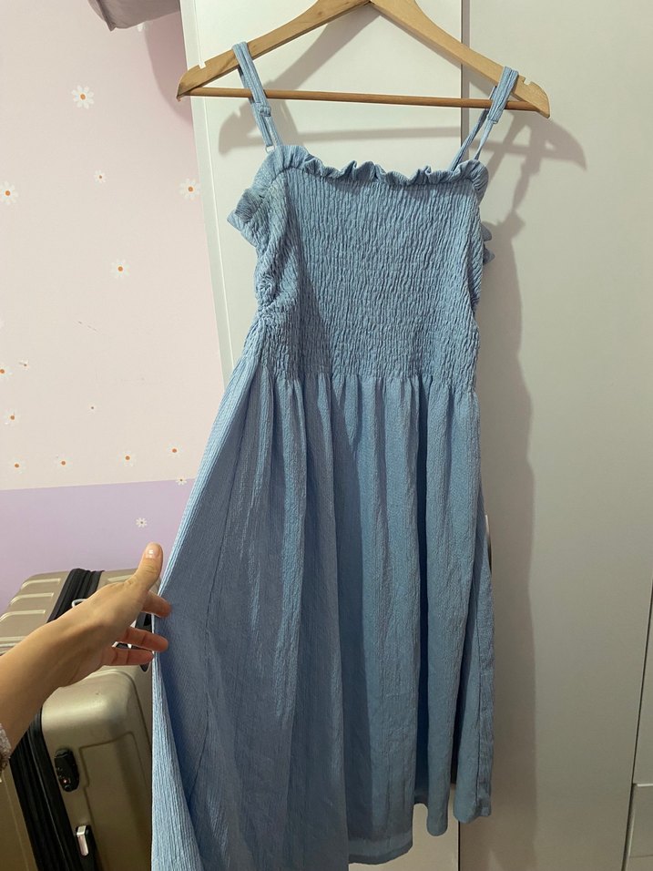 Pastel mavi renkte, keten kumaştan midi uzunlukta elbise. Askılı ve fırfırlı üst kısmı, bol kesimi rahatlık sağlar. Günlük şıklık için uygundur.