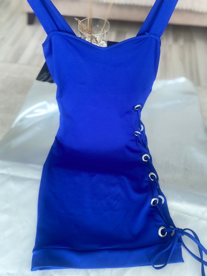 Mavi renkte, askılı ve bel detaylı belden oturan mini elbise. Uzun boylu ve askısız yaka tasarımıyla dikkat çeker. Sentetik kumaştan üretilmiştir.
