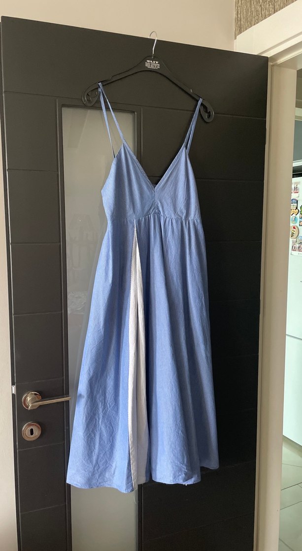 Pastel mavi renkte, keten kumaştan, askılı ve drapeli uzun, bol kesim elbise. Minimalist ve normcore tarzını yansıtır, günlük kullanım için uygundur.