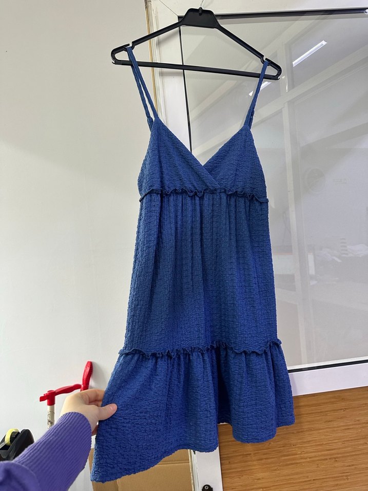 Askılı kolları ve V yaka detayı olan, bol kesim midi boy mavi denim elbise. Fırfır detaylarıyla bohem tarzını yansıtıyor. Günlük kullanıma uygun.