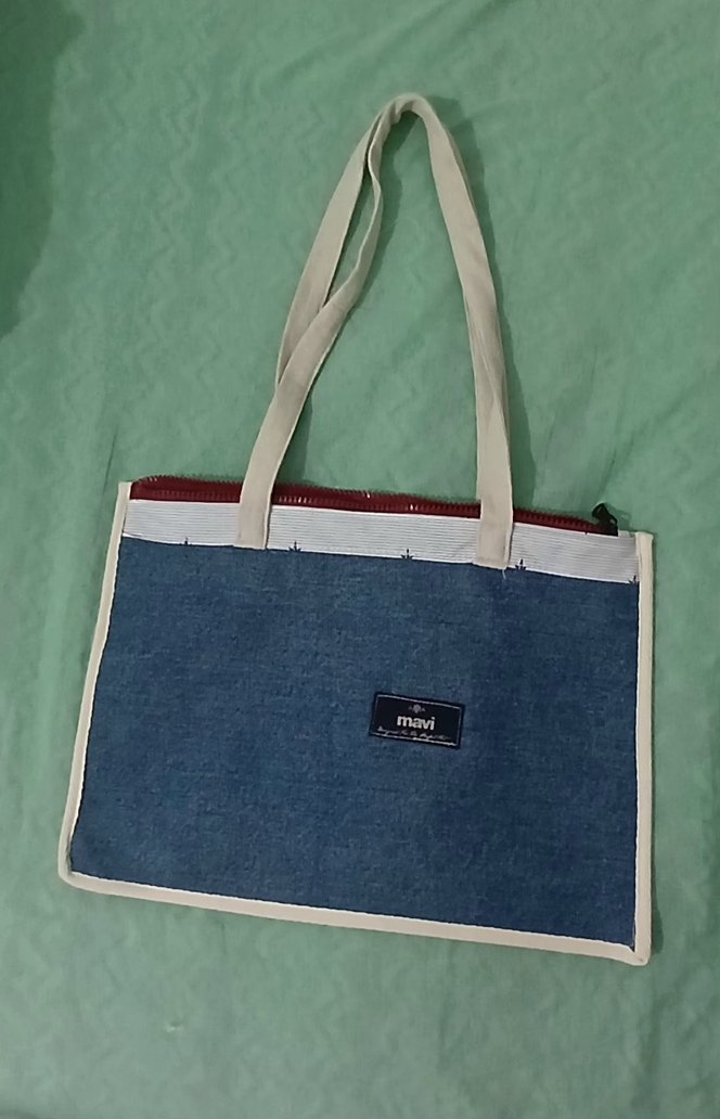mavi ,fermuarlı ve baskılı detaylara sahip kadın çantasi sağlam saplıdır. ek hediyelerle beraber gönderiyorum