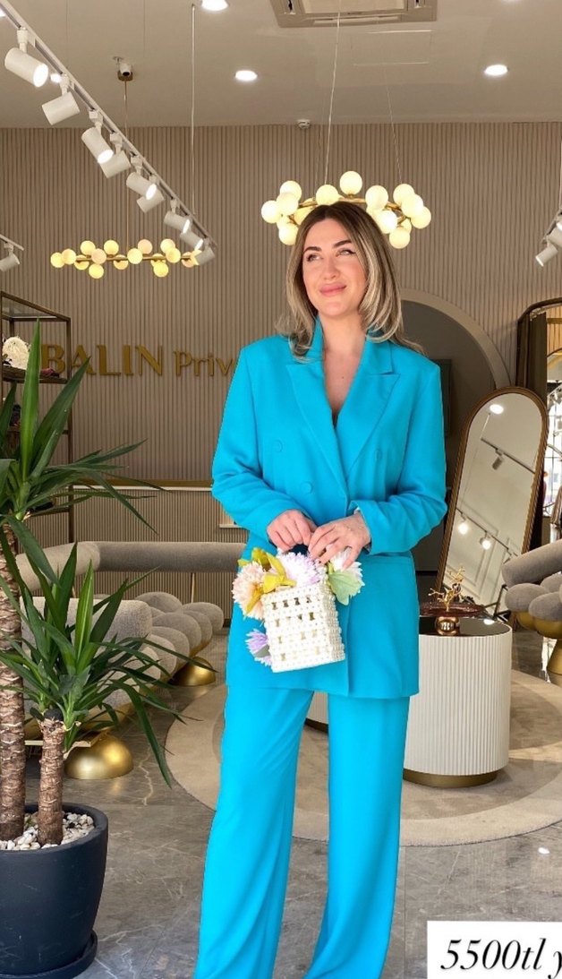 Mavi pastel renkte, regular fit kadın takım elbise. Düğmeli, yakalı ve çok rahat bı kumaşı var ceket astarsız ve hırka rahatlığında mevsımlık kumaştan, düğünler için uygun.