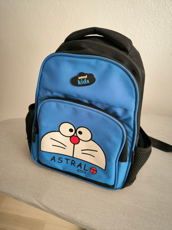Mavi Astral Kids sırt çantası, ön cephesinde renkli çizgi film yüzü ve "kids" yazısı bulunur. Çoklu bölmeleri ve yastıklı askıları vardır.