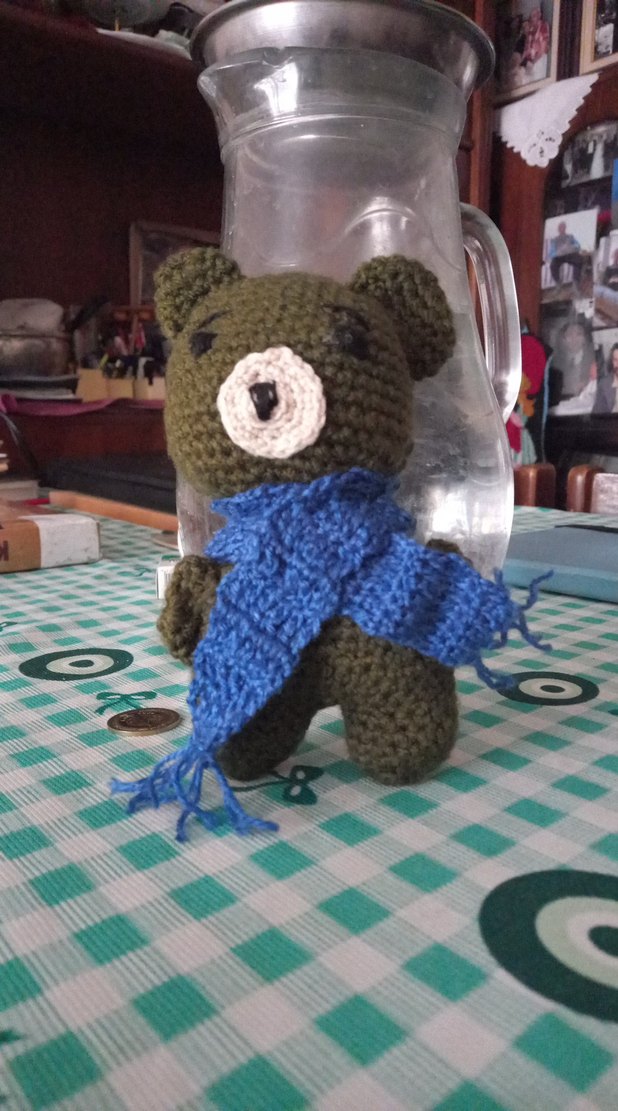 Mavi atkılı kahverengi oyuncak ayı