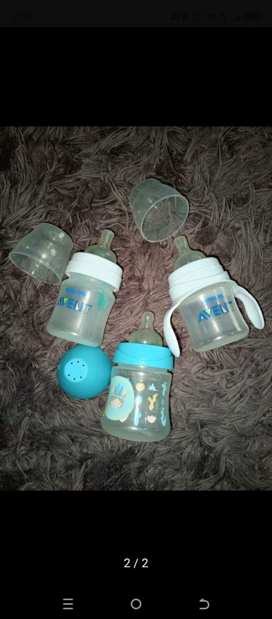 Pastel mavi Avent bebek biberon seti, yumuşak emzik ve koruyucu kapaklıdır. Bir biberonda tutması kolay kulplar bulunur.