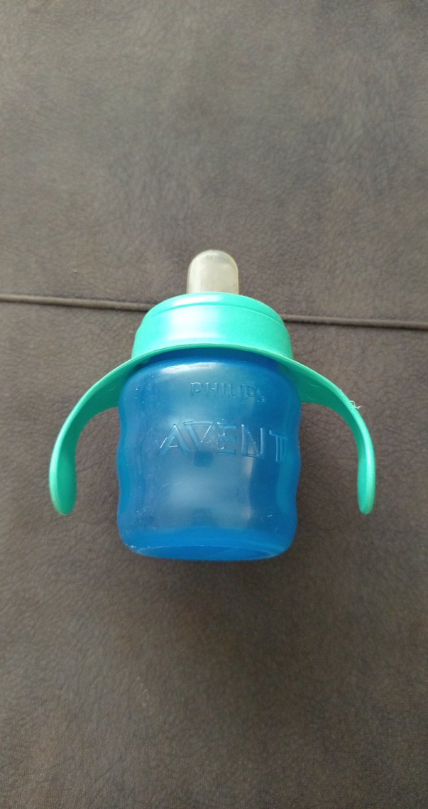 Kolay tutulabilen saplı ve yumuşak emzikli mavi Avent bebek biberonu.