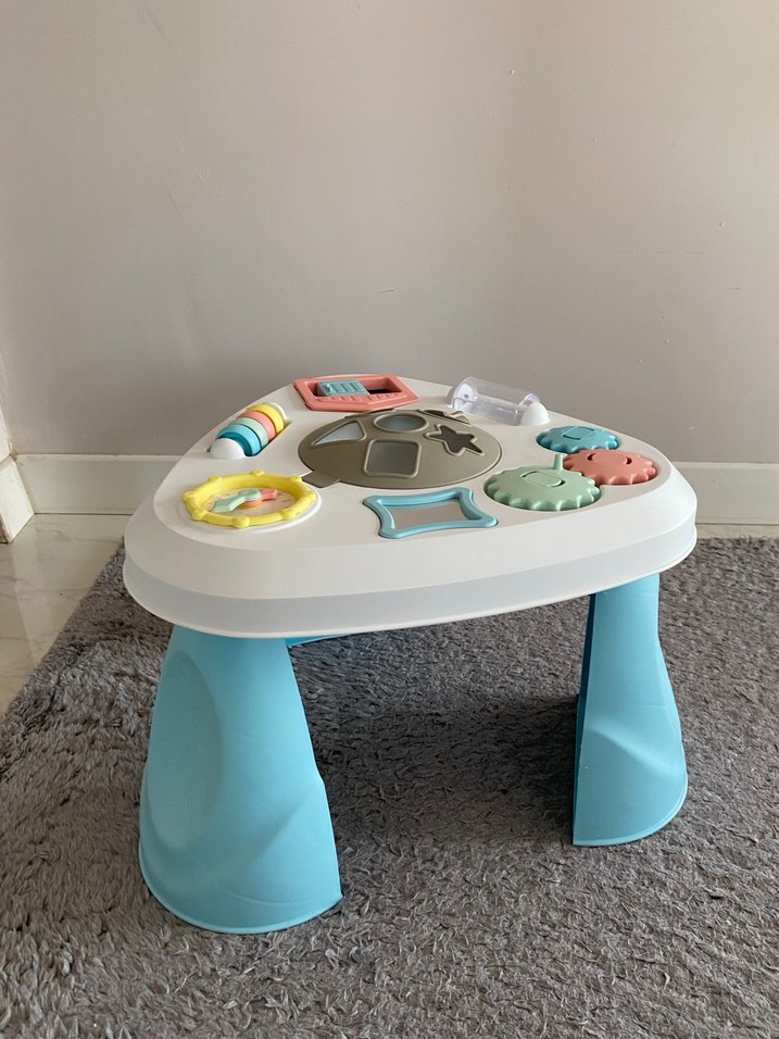 Çocuklar için etkileşimli öğelerle donatılmış açık mavi eğitici aktivite masası.