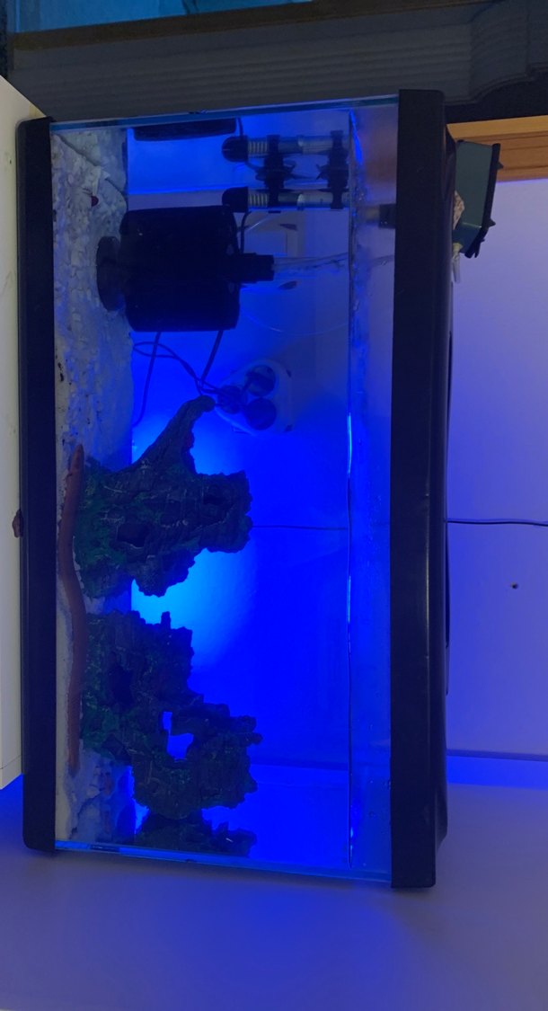 Dekoratif kayalar ve filtreleme sistemi bulunan, koyu mavi aydınlatmalı akvaryum tankı.