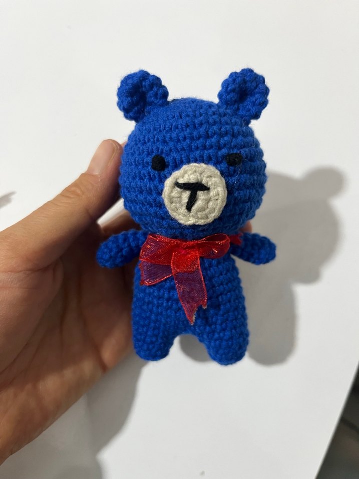Mavi örgü peluş ayıcık, renkli kırmızı fiyonk ve yumuşak dokusuyla el yapımıdır. Küçük ve tutulması kolaydır.