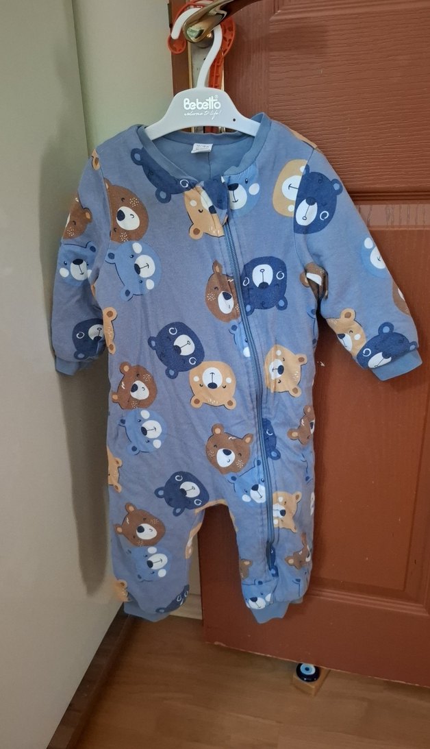 Mavi, kahverengi ve gri tonlarda ayıcık desenli, düğmeli önlü, uzun kollu ve yuvarlak yakalı, yumuşak ve sıcak kumaştan bebek tulumu. 1 buçuk tog hiç bir sıkıntısı yok