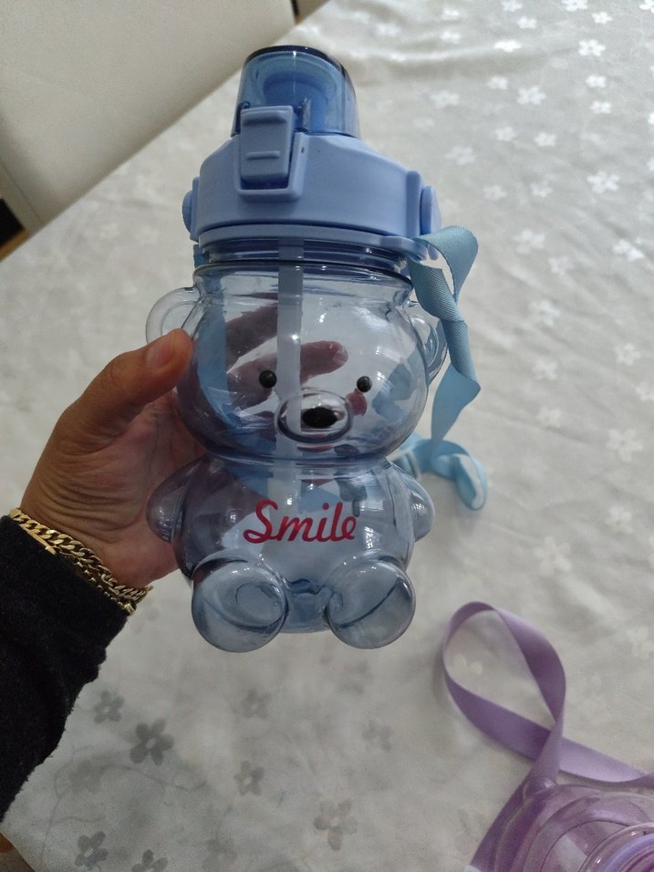Mavi ayıcık şeklinde çocuk matara, güvenli açılır kapak ve renkli askı ile. Önünde "Smile" yazısı bulunur.