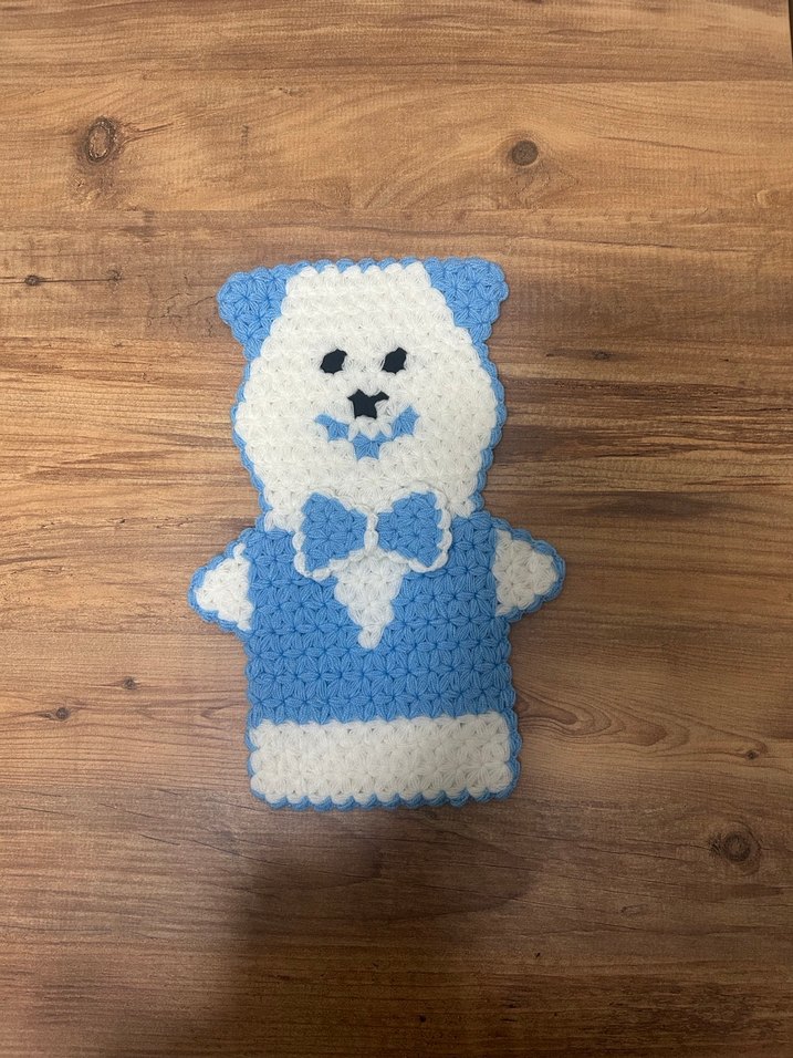 Pastel mavi renkte, papyonlu ayıcık tasarımına sahip yumuşak dokulu banyo lifi. #ceyiz #lif #örgülif