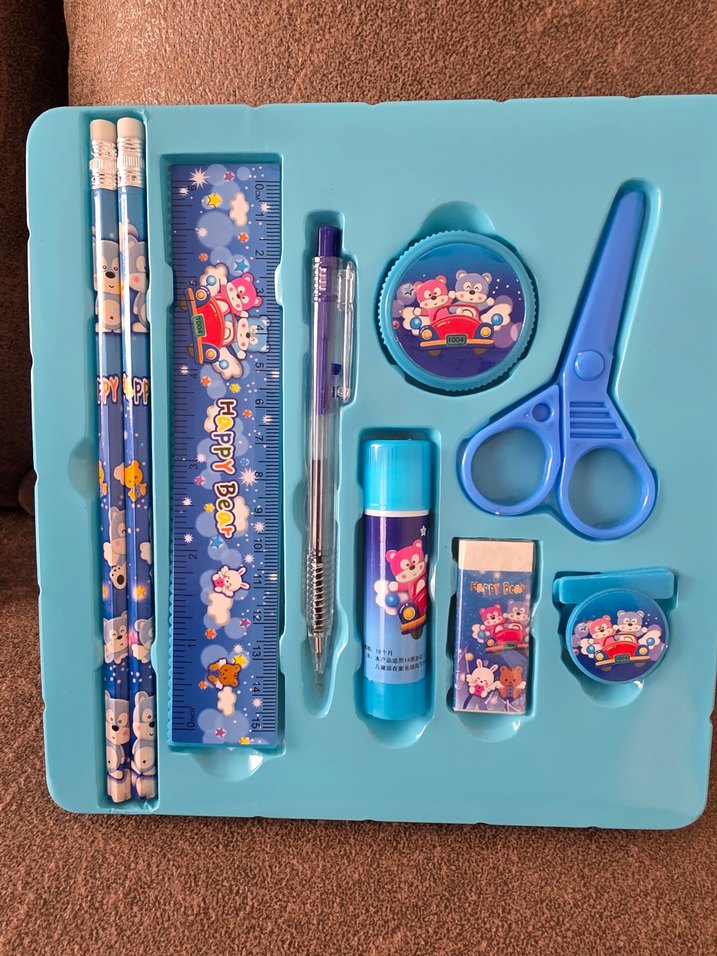 Renkli mavi ayıcık desenli kırtasiye seti; kalemler, cetvel, tükenmez kalem, makas, yapıştırıcı, silgi, kalemtıraş ve bant makarasından oluşur.