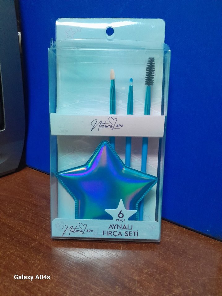 Mavi saplı 6 parçadan oluşan makyaj fırça seti, küçük aynayla birlikte detaylı makyaj için uygundur. ✨