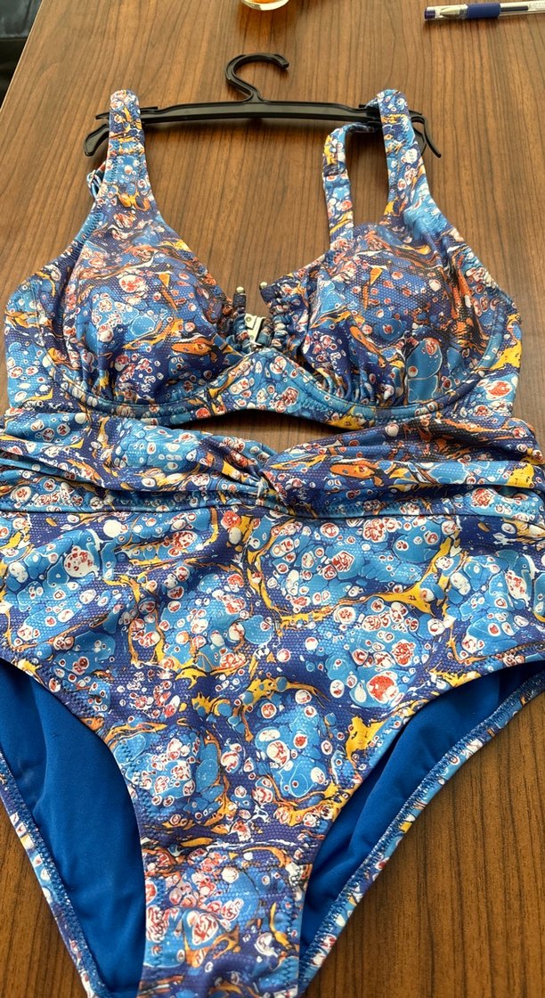 Bu sıkı kesim bikini, renkli mavi bağcıklı desene, bohem stile ve askılı kollara sahiptir. Düğme detaylıdır ve normal midi uzunluğundadır, plaj için uygundur.