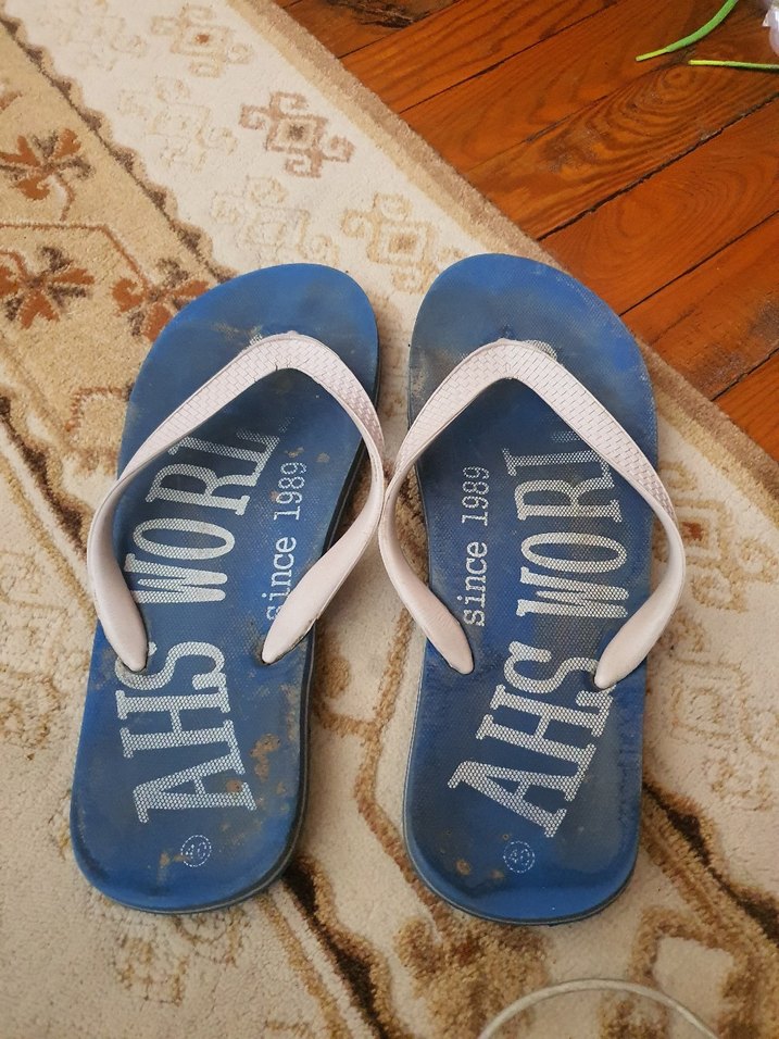 Mavi renkli, pastel tonlarda bağcıklı bantlara sahip, bohem ve retro tarzda erkek terlikleri. İç kısmında "MOMSHY" yazısı bulunur.