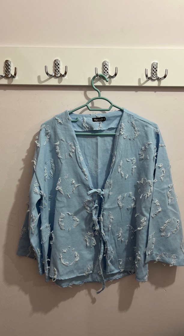 Mavi keten kumaştan, uzun kollu ve düğmeli, V yakalı bohem tarzda bol kesim kimono. Midi boy ve bağcıklı, rahat günlük kullanım için uygun.