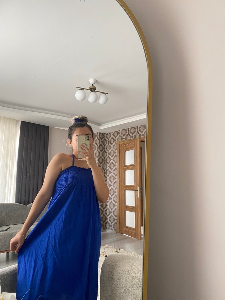 Bağcıklı yakalı ve ip askılı, bol kesim mavi denim midi elbise. Batik desenli ve püskül detaylı, günlük kullanıma uygun.Bağcıklarını istediğiniz gibi kullanabilirsiniz. 1 kere giyildi