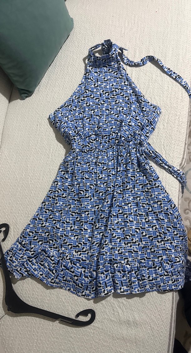 Mavi renkli, bağcıklı, bol kesim bohem mini elbise. Halter yaka sırt açık bağlamalı, fırfırlı tasarıma sahip, günlük kullanıma uygun.