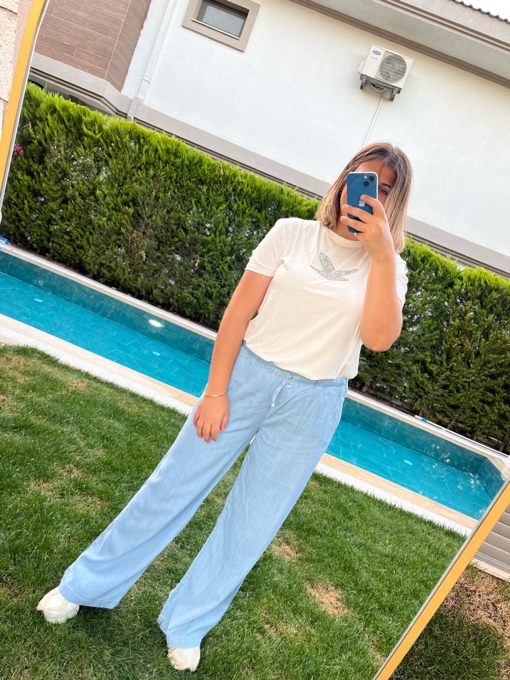 Bağcıklı, bol kesim, pastel mavi kot pantolon. Bağcıklı ve tie-dye desenli, rahat ve şık sokak stili pantolon. S-M-L-XL beden.