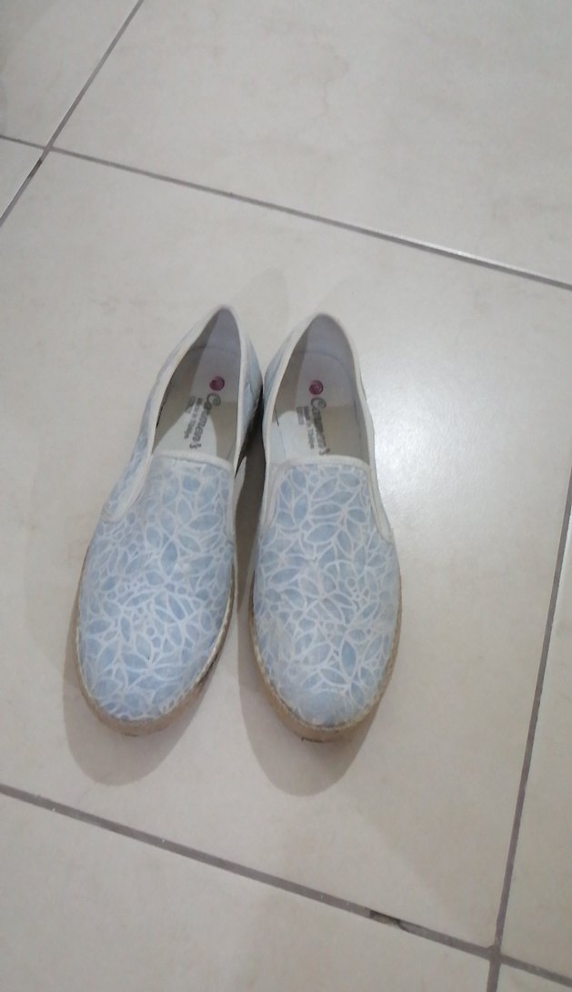 Mavi pastel tonlarda bağcıklı, dolgu topuklu ve kauçuk tabanlı kadın espadril ayakkabı, günlük rahat kullanıma uygundur.