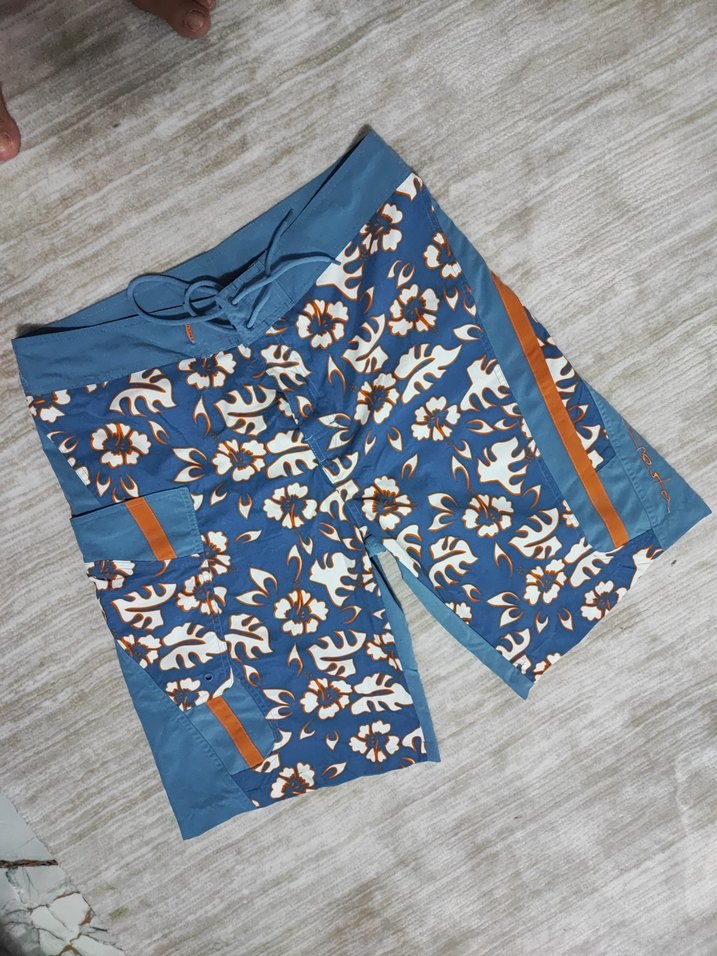 Mavi bağcıklı ve bel detaylı, bol kesim erkek deniz şortu