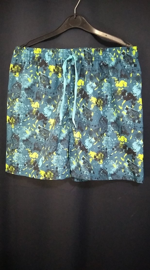 Mavi ve gri tie-dye desenli, bağcıklı, bol kesim erkek mini şort. Plajda rahat kullanım için uygundur.