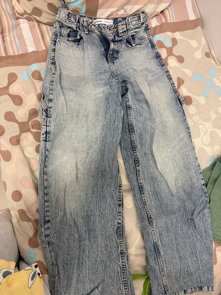 Mavi bağcıklı, geniş kesim, midi boy kot pantolon. Pastel tie-dye desenli, rahat ve günlük sokak stili için uygun.