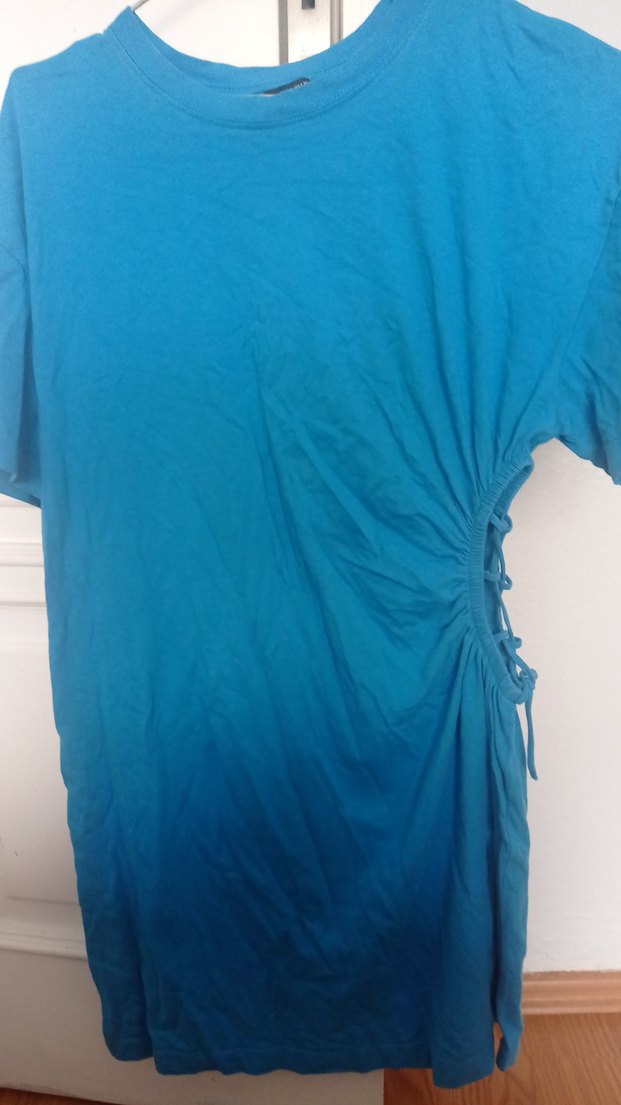 Mavi renkli, keten kumaştan yapılmış, yan tarafı bağcıklı drapeli, kısa kollu ve yuvarlak yakalı hamile elbisesi. Rahat kesimi ve parlak batik deseniyle günlük kullanım için uygundur.