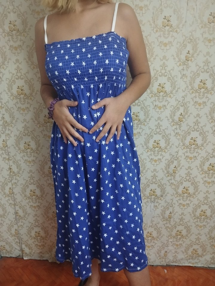 Mavi pamuklu hamile elbisesi, bağcıklı, bol kesim, renkli batik desenli ve günlük kullanım için uygundur.