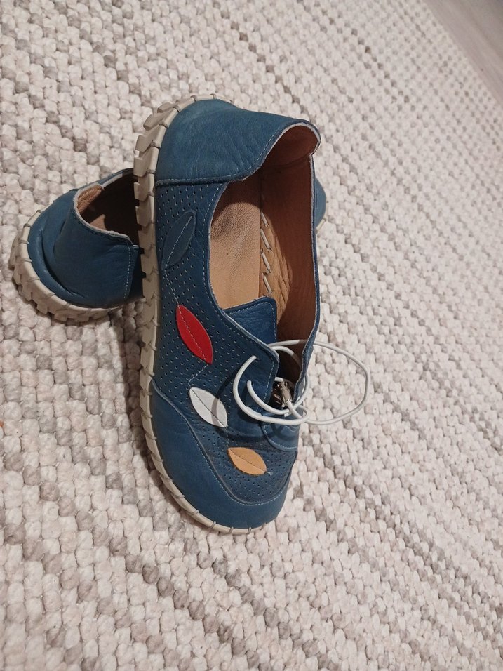 Mavi, bağcıklı ve kadın günlük ayakkabısı, yumuşak kauçuk tabanlıdır ve sade tasarıma sahiptir. Günlük kullanım için uygundur. Cezaevi mahkumları tarafından elde yapılmış bir ayakkabıdır..
