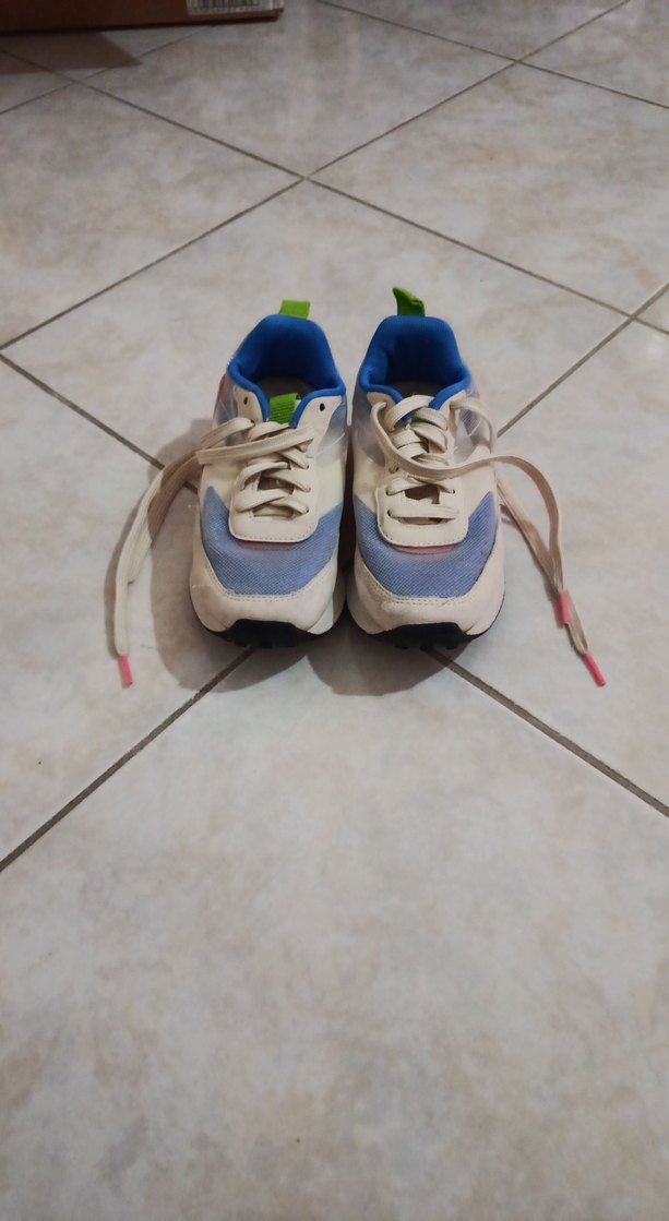 Pastel mavi bağcıklı ve cırt cırtlı, bağcıklı kadın spor ayakkabısı. Lastik tabanlı, stilettolu ve tie-dye desenlidir.