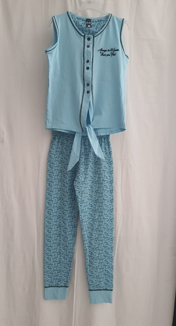 Kolsuz, düğmeli ve belden bağcıklı üst ile pastel mavi desenli rahat pantolondan oluşan kadın pijama takımı. Rahat ve günlük tarzda.
