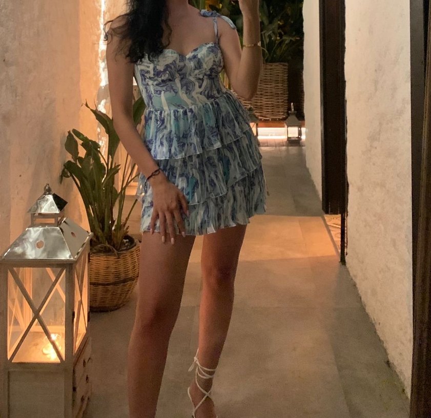 Mavi mini elbise, straplez yaka ve kat kat fırfırlı detaylara sahip. Bağcıklı ve tie-dye desenleriyle bohem tarzı yansıtıyor. 1 kez giydim