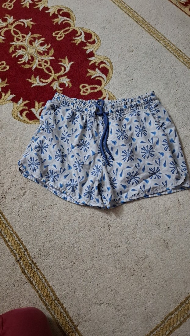 Mavi bağcıklı detaylı, hafif sentetik kumaştan yapılmış bol kesim mini şort. Plaj veya günlük sokak stili için uygun.
