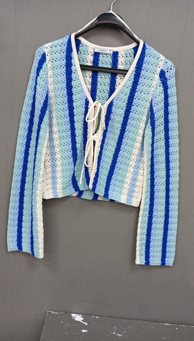 Uzun kollu, V yaka ve bağcıklı kadın hırka. Gevşek kesim, pastel mavi tie-dye desenli, midi boy örgü bohem tarzda, günlük kullanım için uygun. s. m. l. beden. reserve marka.