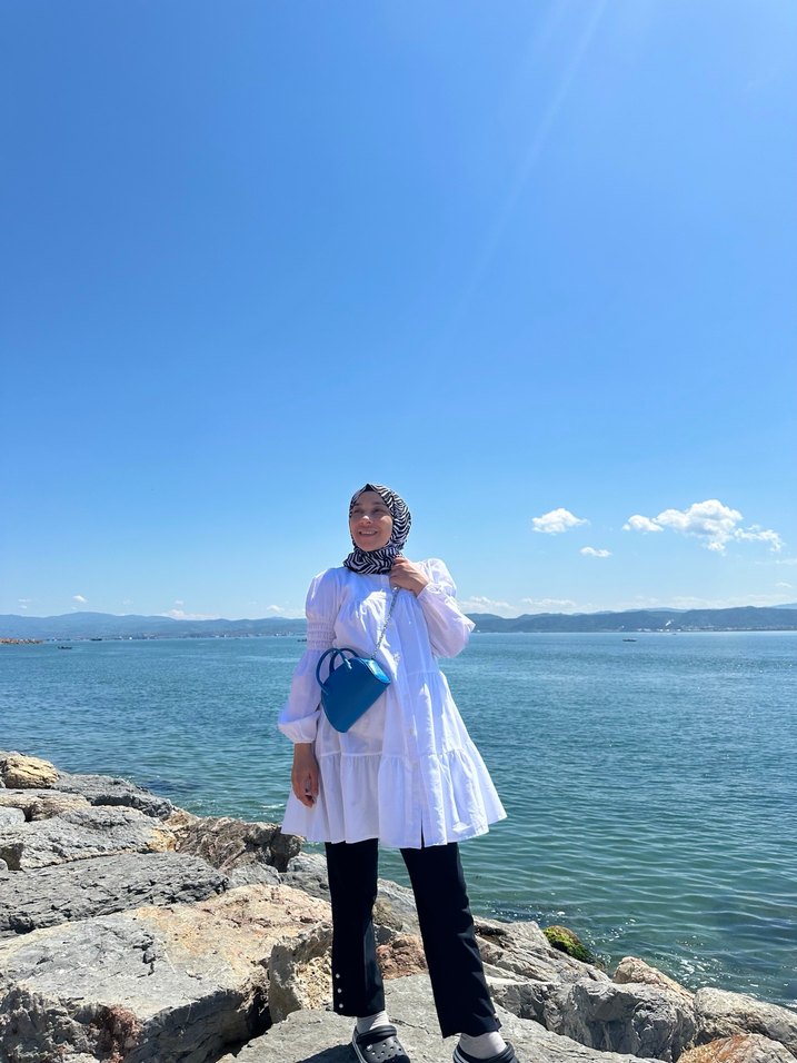Beden s yazıyor ama ben hamileyken giydim 44 bedene kadar olur diye düşünüyorum Bağcıklı, yüksek yakalı, uzun kollu, mavi açık tonlarında pamuklu bağlama desenli, bol kesim midi tunik. Günlük kullanıma uygun sade ve mütevazı stil.