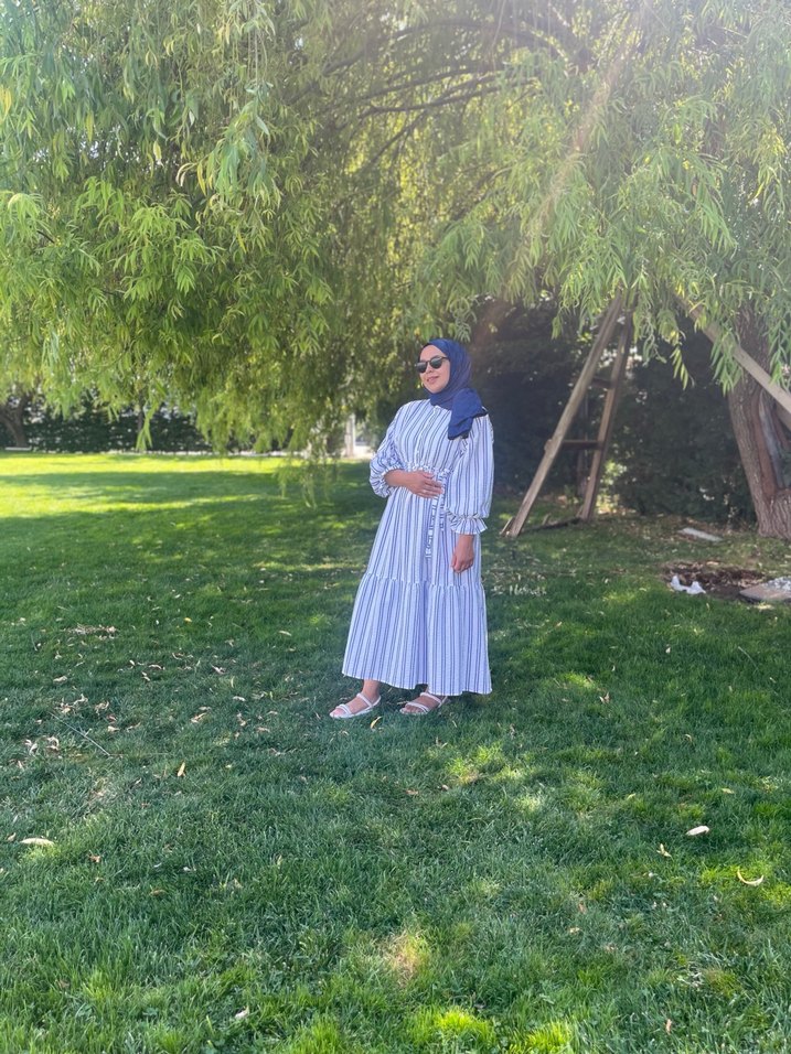 Mavi Bağcıklı Pamuklu Uzun Elbise