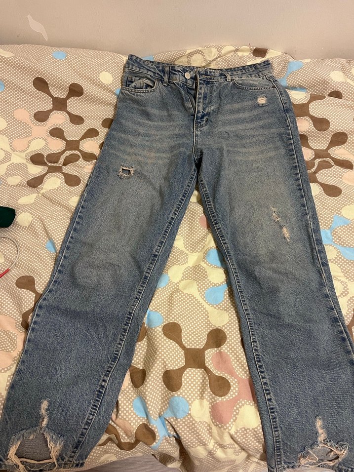 Pastel mavi bağcıklı, rahat kesim, midi uzunlukta, bağcıklı detaylı bağcıklı kot pantolon. Günlük rahat sokak stili için uygundur. Deformesi yoktur etiketi yok