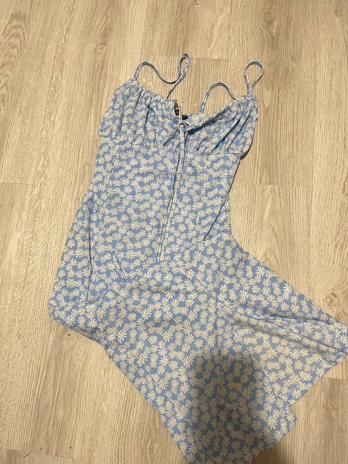 V yakalı, ince askılı, fermuarlı ve bağcıklı bu mavi pastel elbise yumuşak sentetik kumaştan olup rahat bohem tarzı sunar.