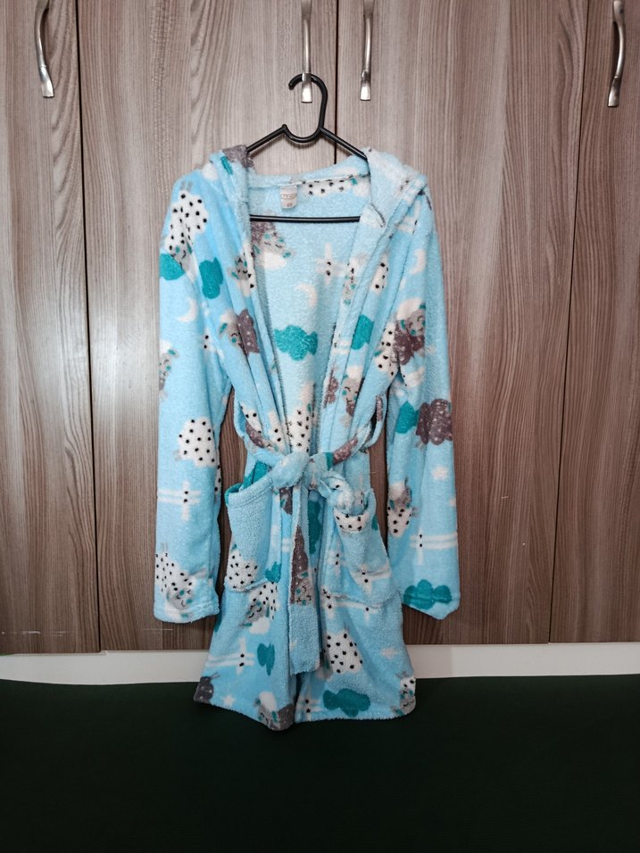 bornoz, yumuşak ve rahat kumaşlı, bol kesim uzun kollu, pastel mavi bağcıklı desene sahip. Ayarlanabilir kemer ile konforlu kullanım sağlar.