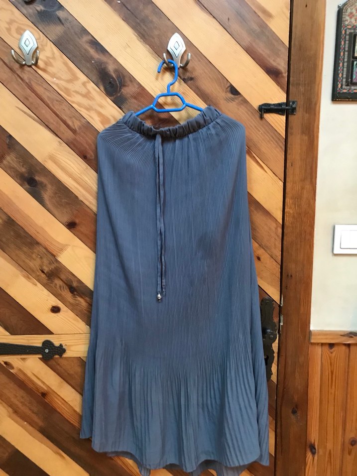Yumuşak keten kumaştan yapılmış, bağcıklı bel ve pilili uzun, bol kesim mavi tie-dye desenli bohem tarzı etek. Günlük kullanım için uygundur. Lekesi var fotoda görülüyor.